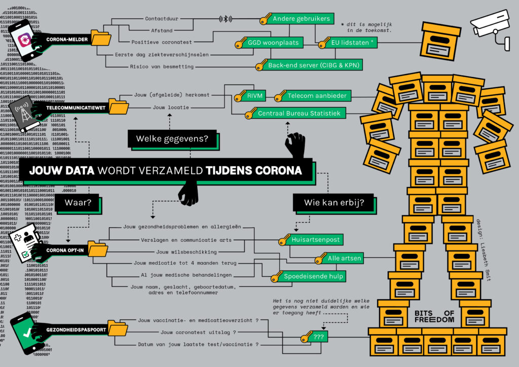 De afgelopen tijd deden we onderzoek naar vier corona-maatregelen: de CoronaMelder, de wijziging van de Telecommunicatiewet, de Corona Opt-in en het gezondheidspaspoort om twee vragen te beantwoorden: 1) Welke gegevens worden er met deze maatregelen verzameld? en 2) Waar komen deze gegevens terecht?